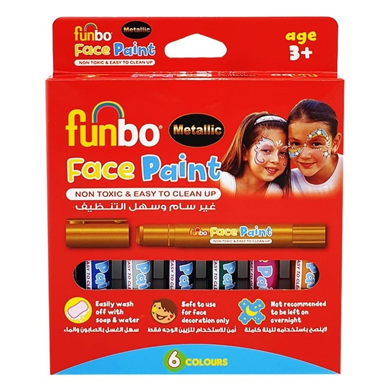 أقلام تلوين على الوجه ميتاليكغير سامة ، و سهلة التنظيفالحجم : 6 GMSالعبوة : 6 ألوانلا ينصح بتركها على الوجه طوال الليل