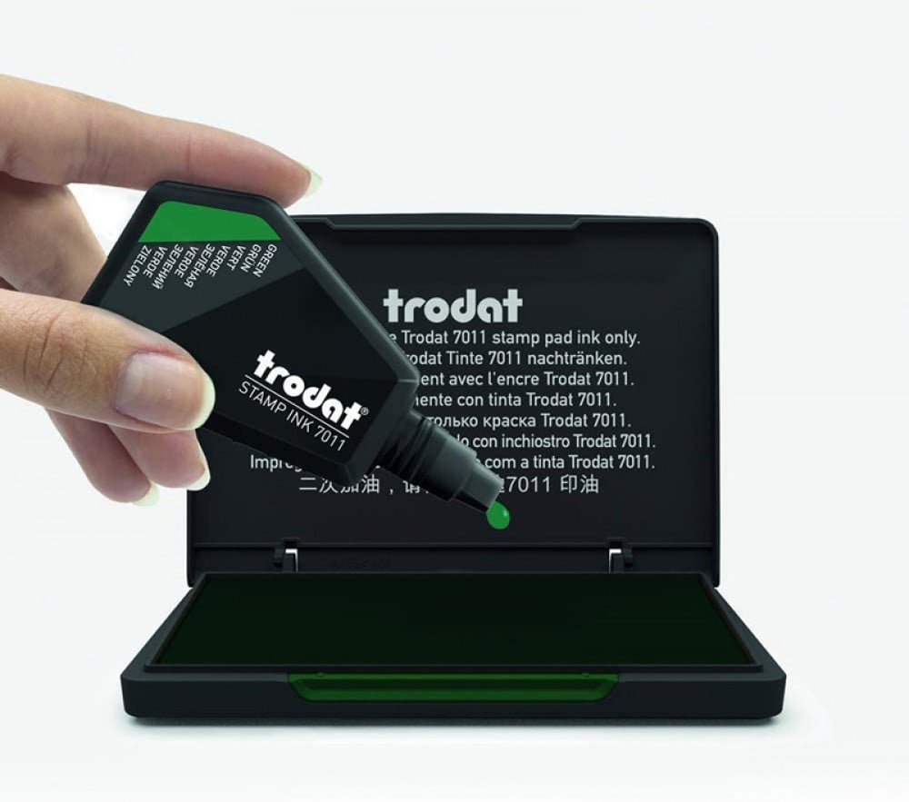 Trodat stamp inks are specially developed for the modern stamp market's most varied demands. They offer optimal long-term behavior, contour sharpness, and guarantee impressions which will last for decades. Stamp inks for reinking the hand stamp pads are obtainable in black, blue, red and green