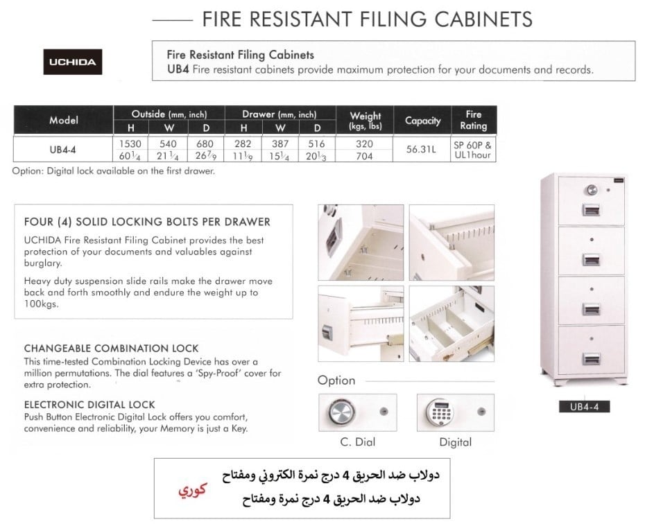 FIRE RESISTANT FILING CABINTSFIRE RATING : SP 60P & UL 1 HOUR4 TierCAPACITY : 56.31 LWEIGHT : 320 KGDRAWER : H282XW387XD516OUTSIDE : H1530XW540XD680 mmMade in Korea